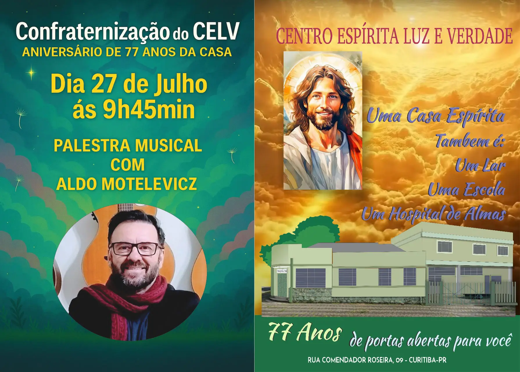 O Centro Espírita Luz e Verdade convida você, sua família e amigos para celebrarmos juntos os 77 anos de atividades da nossa Casa Espírita — um lar de acolhimento, uma escola de aprendizado e um hospital de almas.